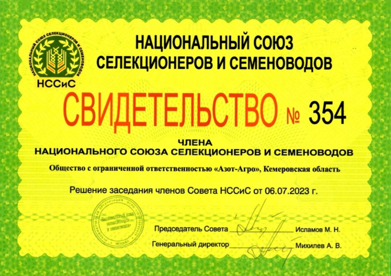 Решением совета Национального Союза Селекционеров и Семеноводов компания была включена в организацию в качестве ассоциированного члена Союза.